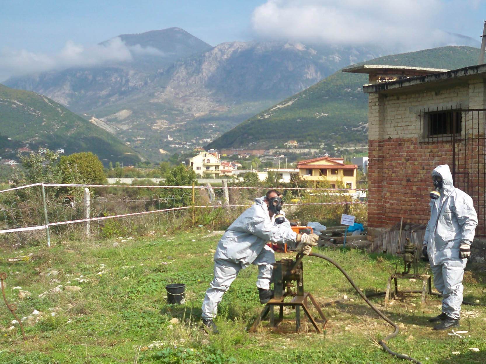 Members of Albania's armed forces begin the process of repackaging and storing dangerous chemicals on October 14 2013