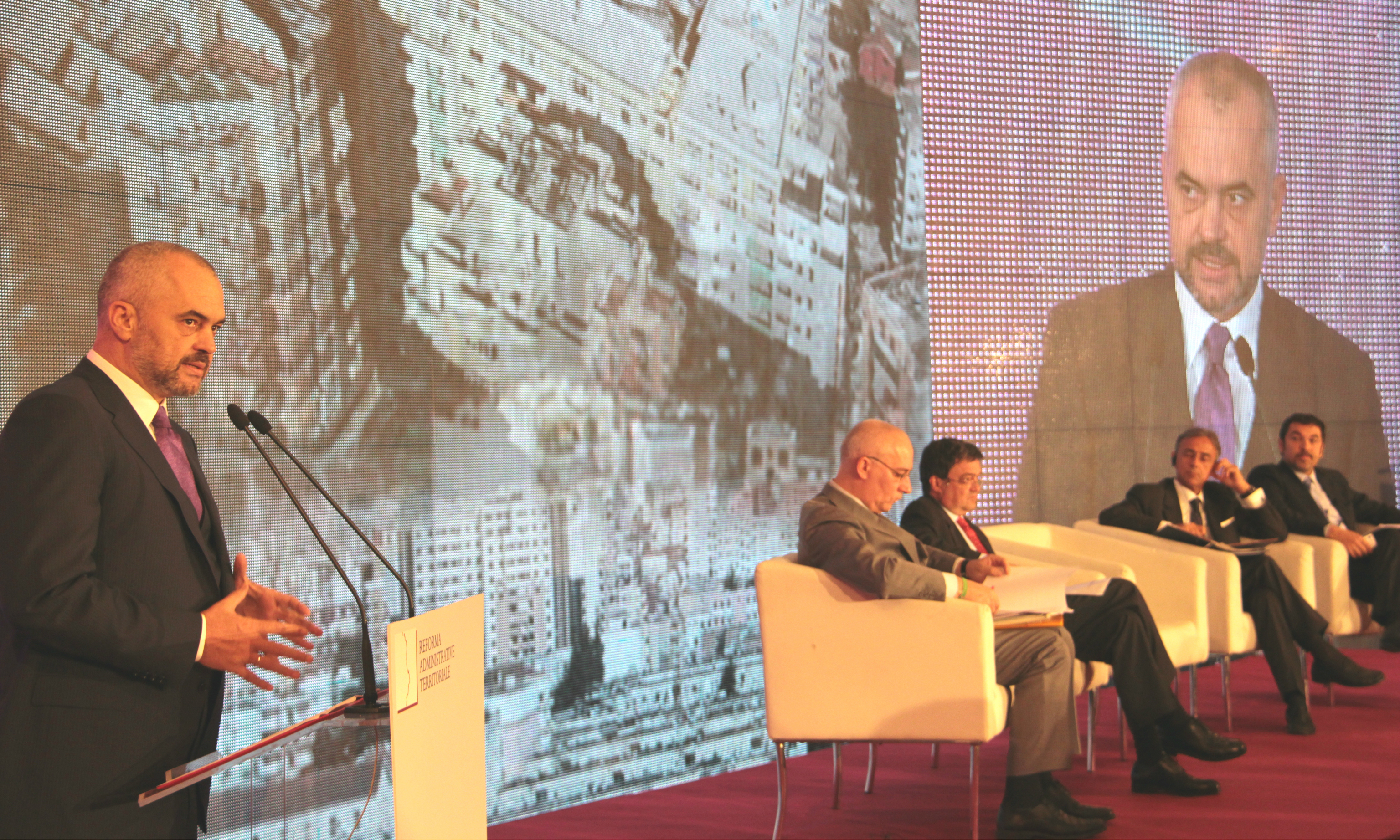 The Prime Minister of Albania, Edi Rama, speaks at a national conference on administrative territorial reform, organized by the Albanian government and the OSCE Presence in Albania, Tirana, 17 October 2013.
