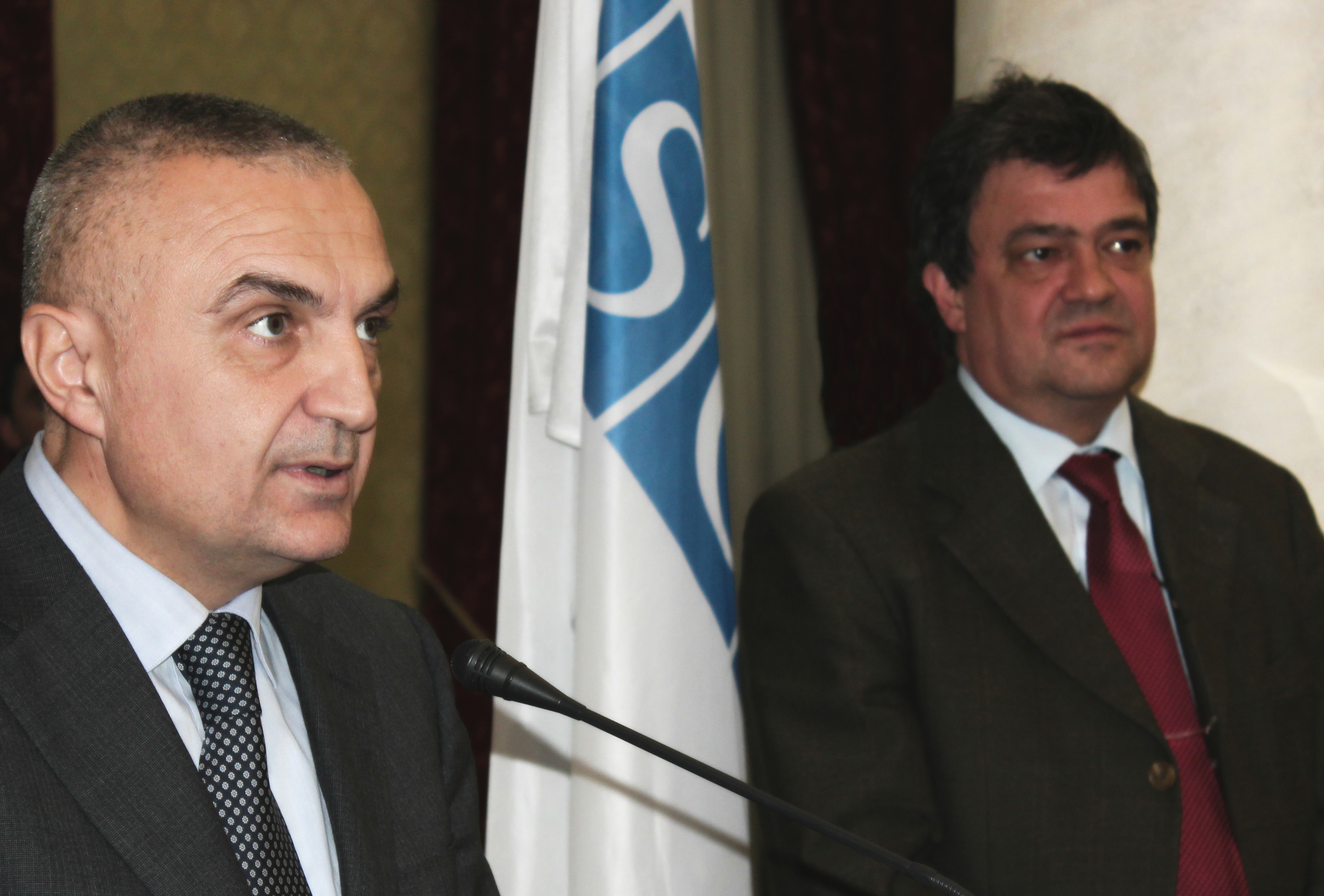 The Speaker of the Albanian parliament, Ilir Meta (l), and the Head of the OSCE Presence in Albania, Ambassador Florian Raunig, address members of parliament during a jointly-organized event, Tirana, 20 November 2013.