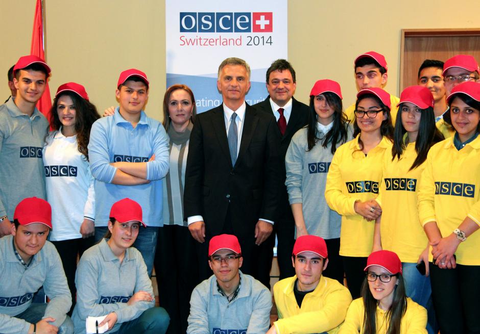 Albanian high school students pose for a group photo with the OSCE Chairperson-in-Office and Swiss Foreign Minister Didier Burkhalter (c), and the Head of the OSCE Presence in Albania, Ambassador Florian Raunig, Tirana, 24 April 2014.