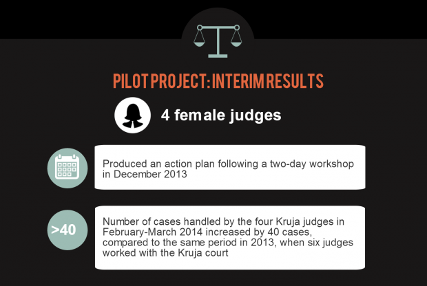 Several months have passed since the launch of the pilot project, and the results are promising: the number of hearings in criminal cases has dropped from an average of 8.8 to 1.8 by the end of March 2014, whereas non-complex civil cases are now completed in 2.4 sessions. The number of cases handled by the four Kruja judges in February-March 2014 increased by 40 cases, compared to the same period in 2013, when six judges worked with the Kruja court.