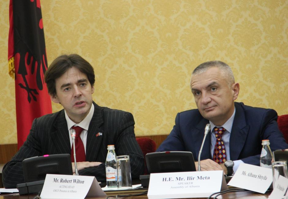 Deputy Head of the OSCE Presence in Albania, Robert Wilton (l), and Speaker of Albania’s parliament, Ilir Meta, address an annual meeting of Western Balkans parliamentary secretaries general, Tirana, 3 December 2015.