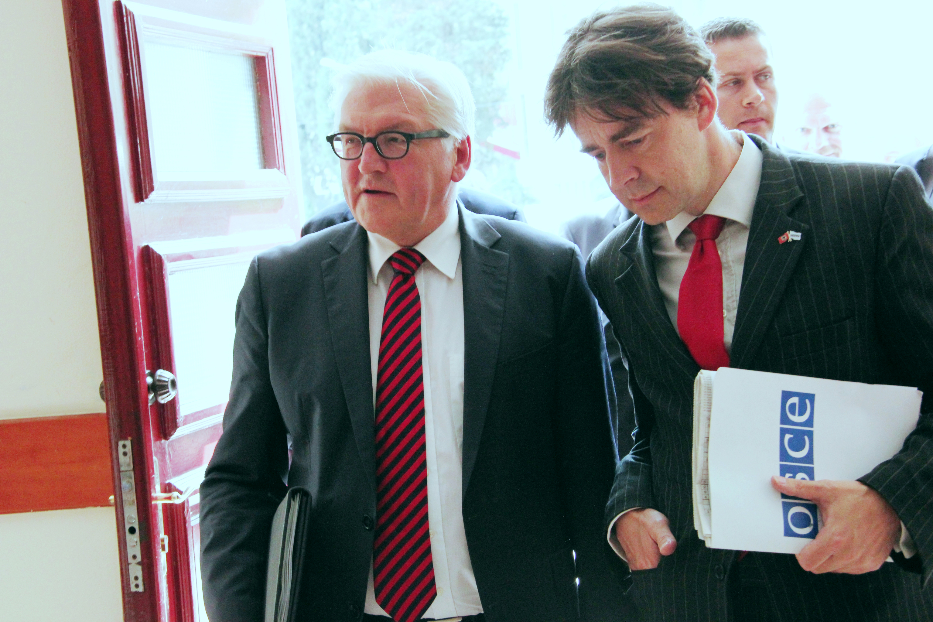 (L-r) OSCE Chairperson-in-Office and German Foreign Minister Frank-Walter Steinmeier and the Acting Head of the OSCE Presence in Albania Robert Wilton in Tirana, 14 June 2016.