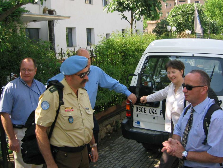 The OSCE staff at the field station in Kukes, Albania, discuss issues of joint concern with the UNMIK police, 15 May 2003.