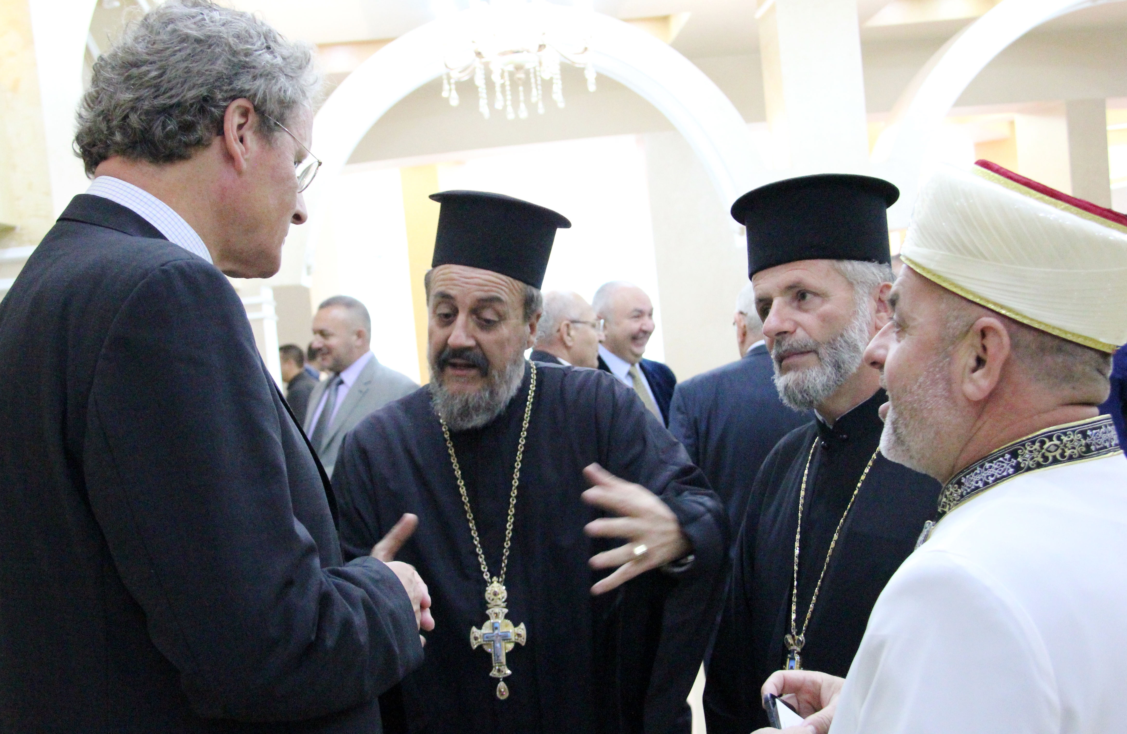 The Head of the OSCE Presence in Albania, Ambassador Bernd Borchardt (left), talks with representatives of religious communities at the margins of the conference United in Countering Violent Extremism, Elbasan, Albania, 12 October 2016.