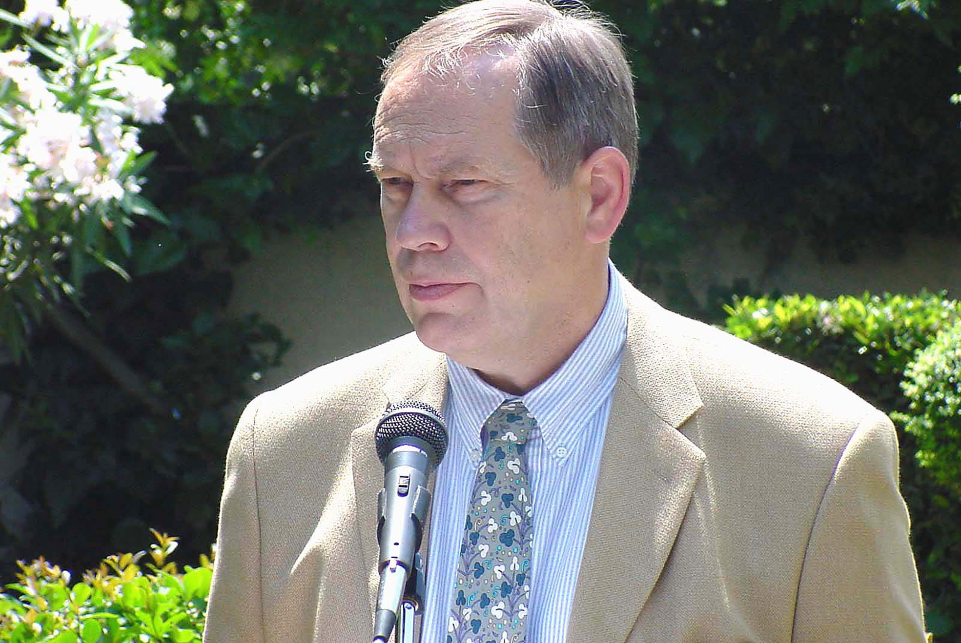 Head of the OSCE Presence in Albania, Ambassador Osmo Lipponen, answers journalists' questions before going to Vienna to deliver his report on Albania to the Permanent Council, 3 June 2003.