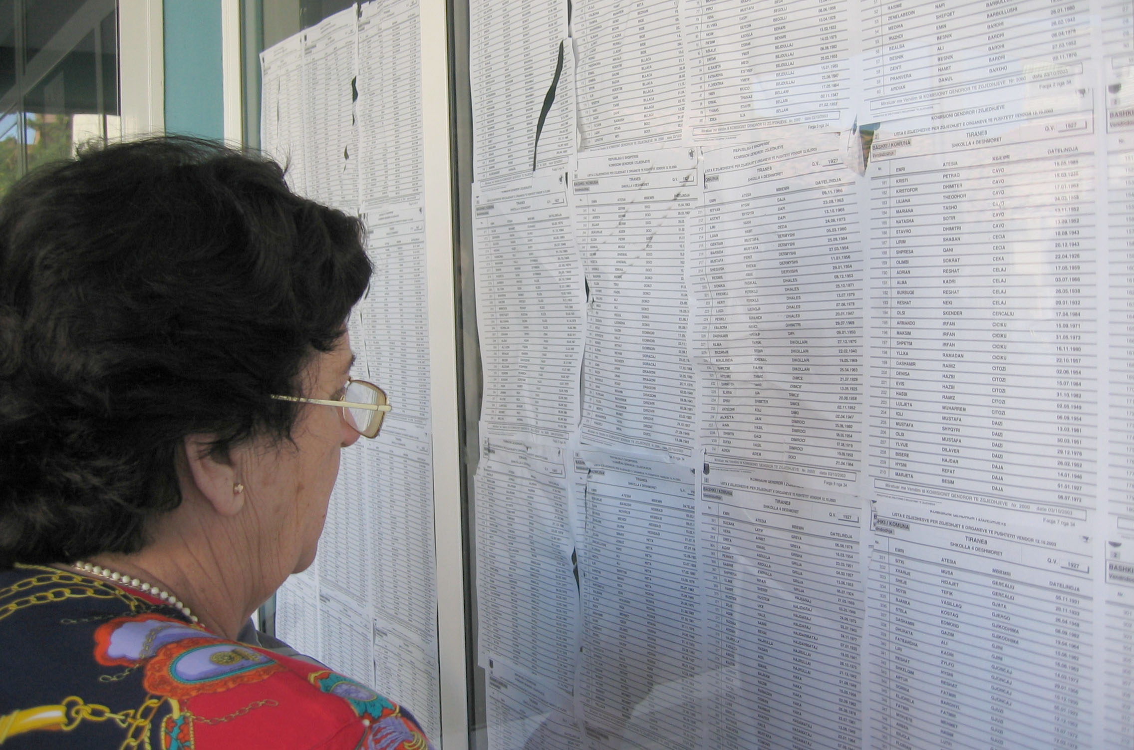 An Albanian voter looks for her name on the voter lists for the 12 October 2003 local government elections, Tirana, 12 October 2003.