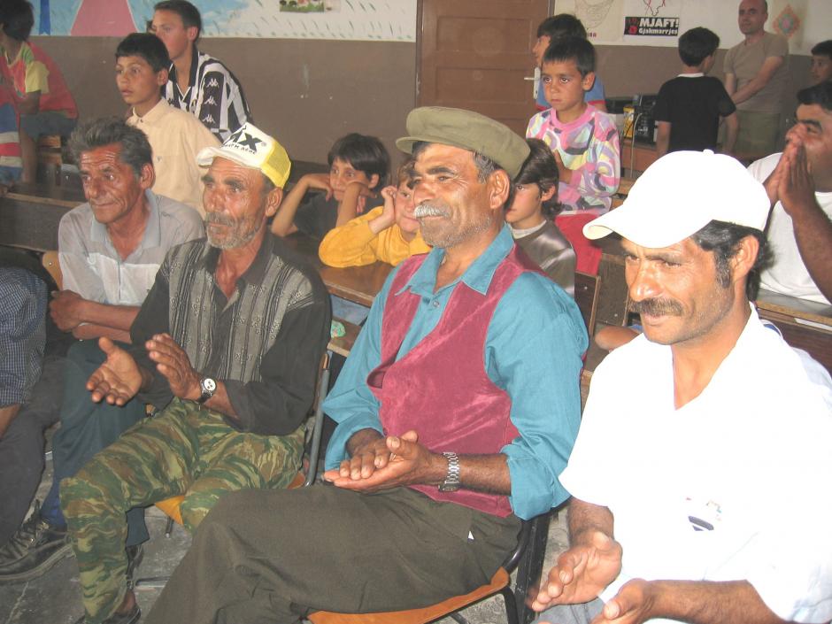 Roma parents applaud their children hosting a show for the inauguration of the OSCE-funded playground in the Zinxhiraj neighbourhood of the city of Gjirokastra, Albania, 14 June 2004