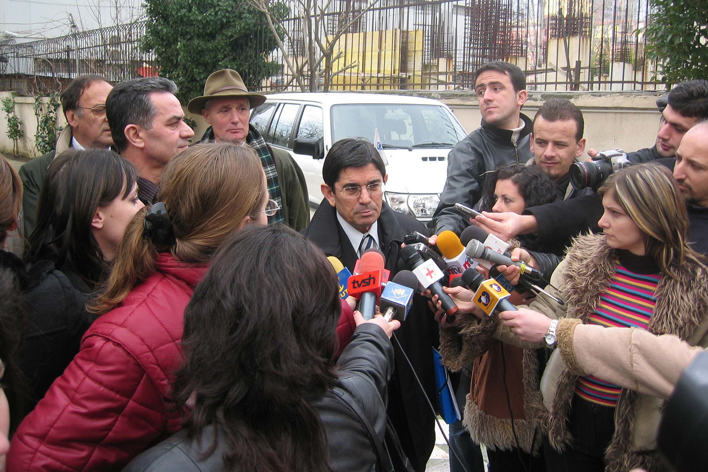 Jemin Gjana of the Democratic Party talks to journalists after initialling an agreement with the Socialist Party on redrawing Albanian electoral zones, at the OSCE Presence premises in Tirana, 28 February 2005.