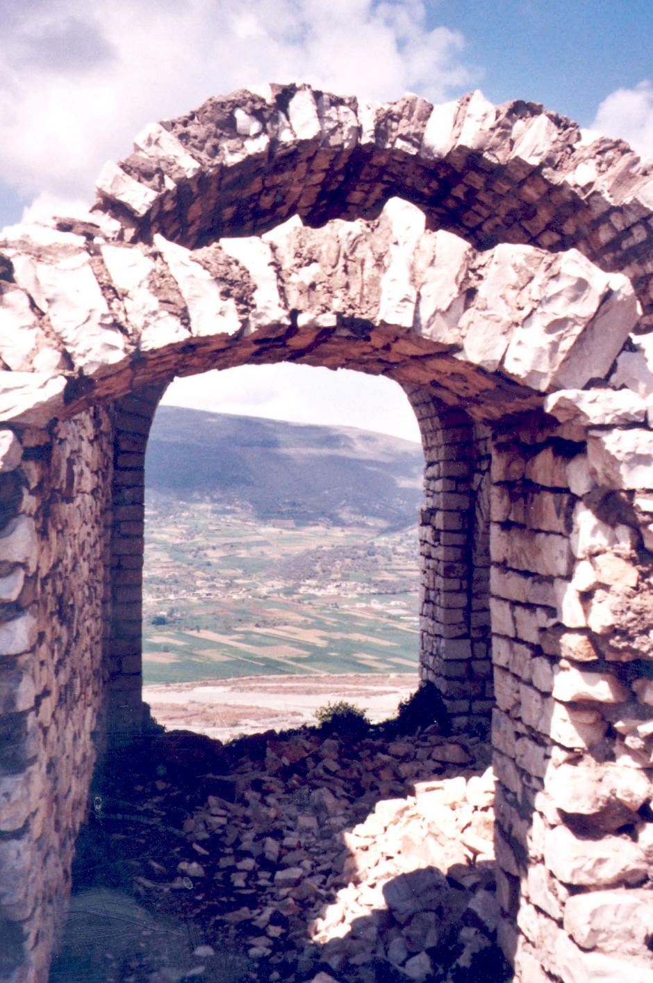 The surrounding area of the Albanian city of Berat as seen from its citadel, April 2005.