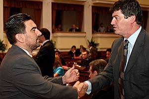 Socialist Party MP Taulant Dedja (left) and Head of the Democratic Party parliamentary group Bamir Topi at a session in the new Assembly. Since 2001, the OSCE Presence has supported the modernization of the Assembly's capacities.