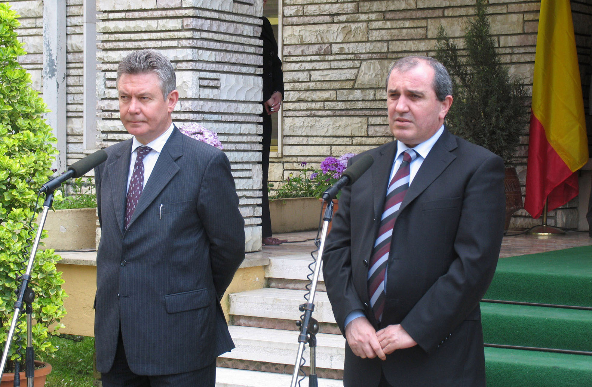 OSCE Chairman-in-Office, Belgian Foreign Minister Karel De Gucht (left), and Albanian Minister of Foreign Affairs Besnik Mustafaj talk to the Albanian media, Tirana, 25 April 2006.