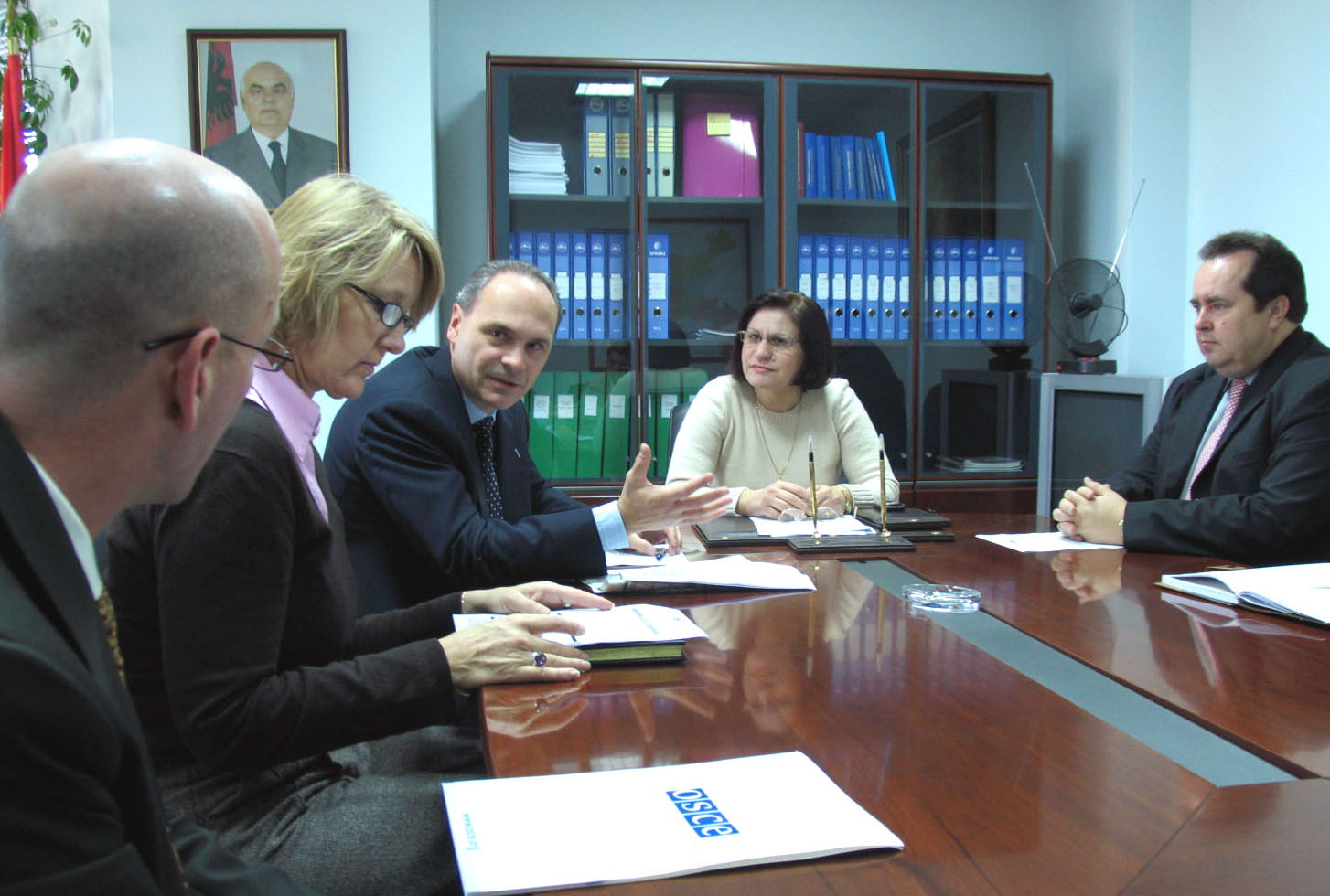 Head of the OSCE Presence Amb. Pavel Vacek (second left), PRCA Director Justina Borici (centre) and Czech Ambassador Miroslav Sindelar (right) sign an agreement on designing a property database financed by the Czech Government, Tirana, 6 December 2006.