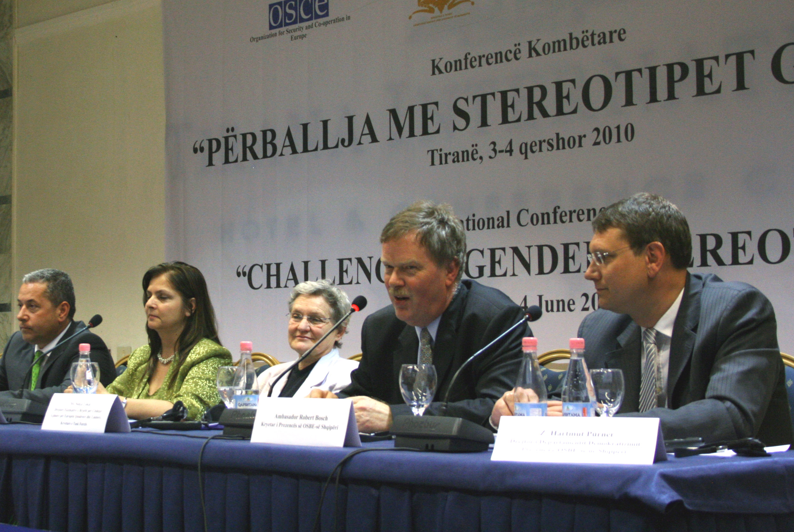 Head of the OSCE Presence in Albania, Ambassador Robert Bosch (second from right) addresses a national conference on challenging gender stereotypes, co-organized by the Presence, together with Minister Spiro Ksera (first from left), Tirana, 3 June 2010.