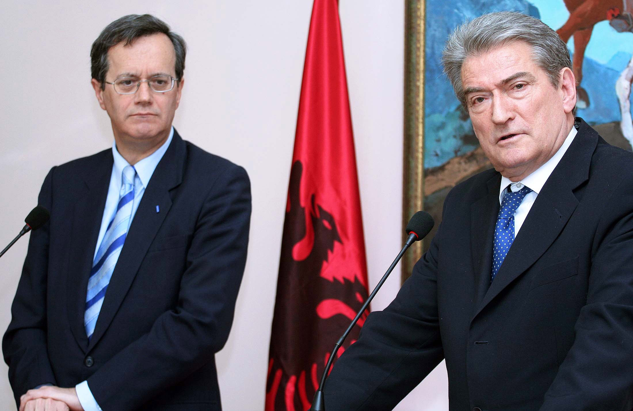 OSCE Secretary General, Marc Perrin de Brichambaut (left) and Albanian Prime Minister address the media following their meeting, Tirana, 10 April 2007.