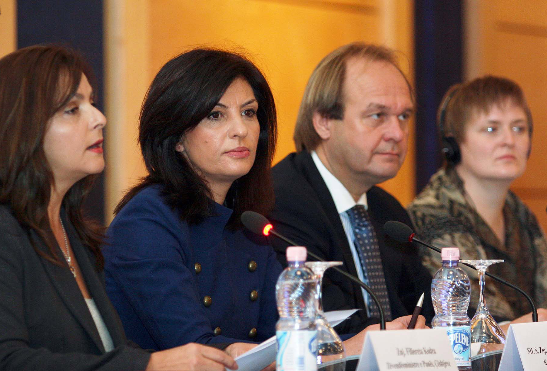 Albanian Deputy Minister of Equal Opportunities Filloreta Kodra, Parliament Speaker Jozefina Topalli and OSCE Presence Ambassador Eugen Wollfarth address a gender conference, part of an OSCE project funded by Swedish and Dutch governments, 9 November 2010