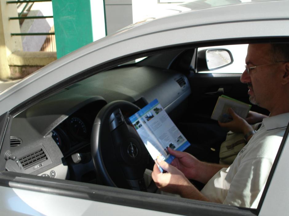 An emigrant returning home reads a leaflet about safe driving at the Morini checkpoint in northern Albania, part of a project supported by the OSCE Presence to help improve driving standards.