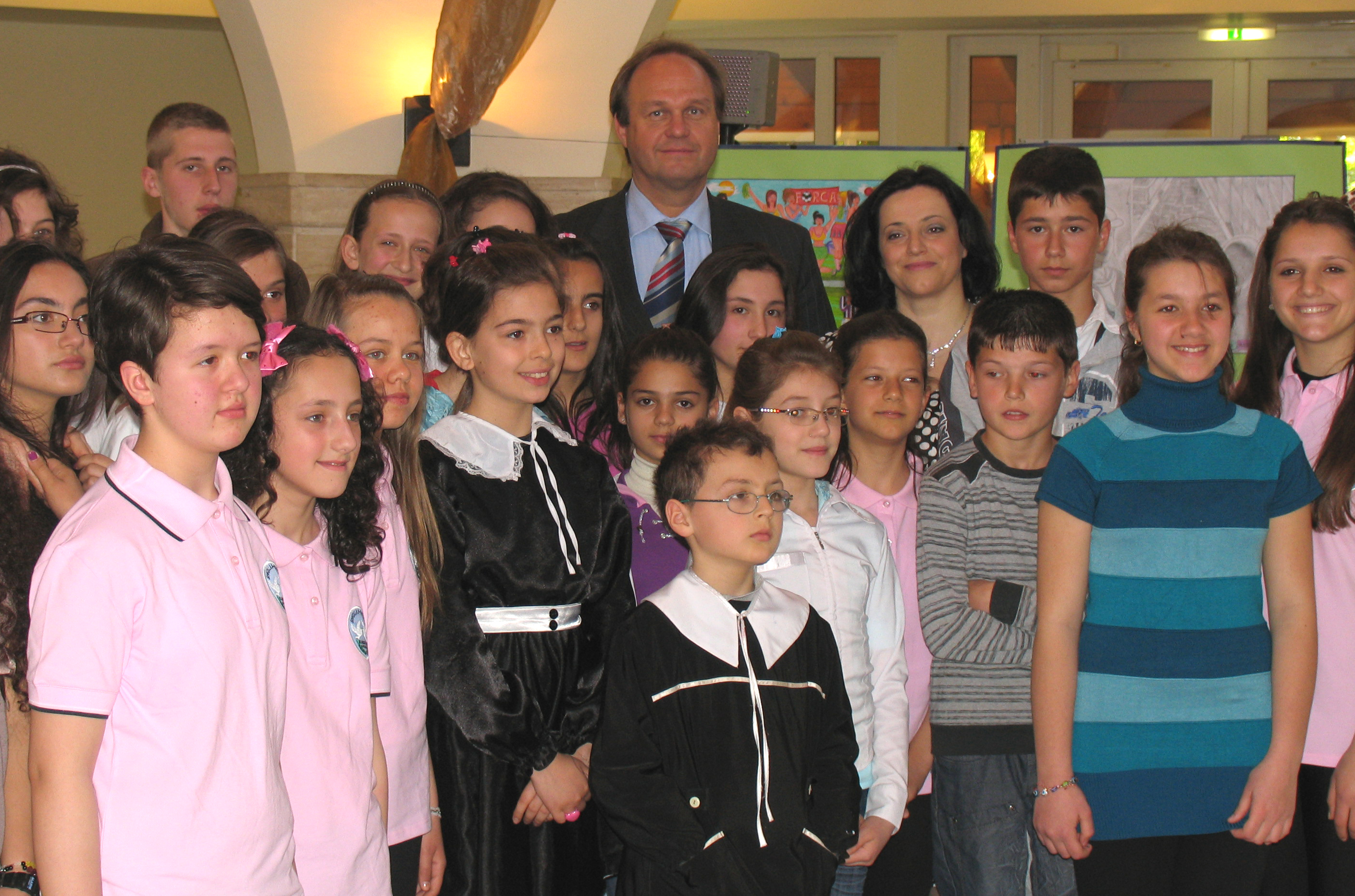 Head of the OSCE Presence in Albania, Ambassador Eugen Wollfarth, and Commissioner for Protection from Discrimination, Irma Baraku, pose with children participating in an anti-discrimination event, Tirana, 11 April 2011.