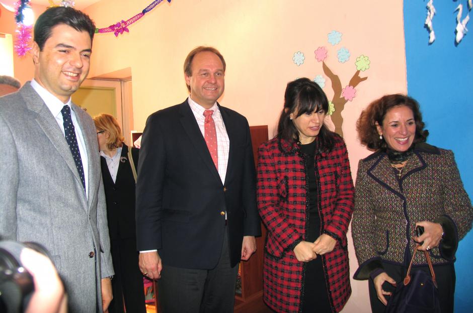 L-r: Tirana Mayor Lulzim Basha, and the Head of the OSCE Presence in Albania, Ambassador Eugen Wollfarth, alongside Mrs. Basha and Mrs. Wollfarth, visit Tirana crèche no. 11, which now has better premises thanks to a donation from the Presence of over 5,000 Euro, Tirana, 14 December 2011.
