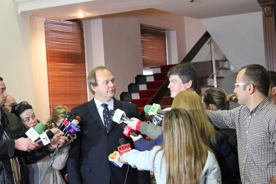 Head of the OSCE Presence in Albania, Ambassador Eugen Wollfarth (left), and the President of the Republic, Bamir Topi (right), addressing the media after a meeting at the President's official residence, Tirana, 8 March 2012.