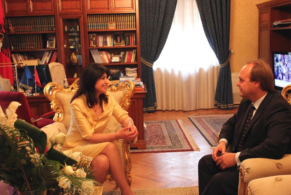 Head of the OSCE Presence in Albania, Ambassador Eugen Wolllfarth (r), meets Albania's Speaker of Parliament Jozefina Topalli on the International Women's Day, 8 March 2012.