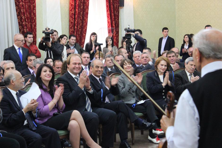 The Head of the OSCE Presence in Albania, Ambassador Eugen Wollfarth (third left), Assembly Speaker Jozefina Topalli (second left), high representatives of the diplomatic corps and Members of Parliament applaud Roma musicians playing at an event marking the 15th anniversary of the Presence, Tirana, 27 March 2012.