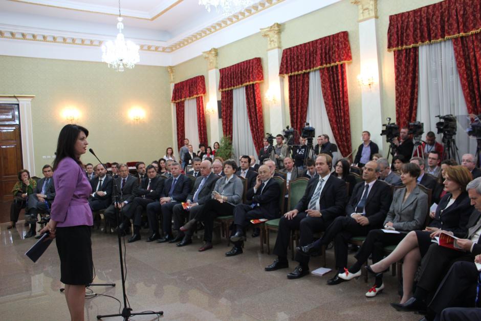 Albania’s Assembly Speaker Jozefina Topalli addresses high representatives of the diplomatic corps and Members of Parliament participating at an event marking the 15th anniversary of the establishment of the OSCE Presence, Tirana, 27 March 2012.