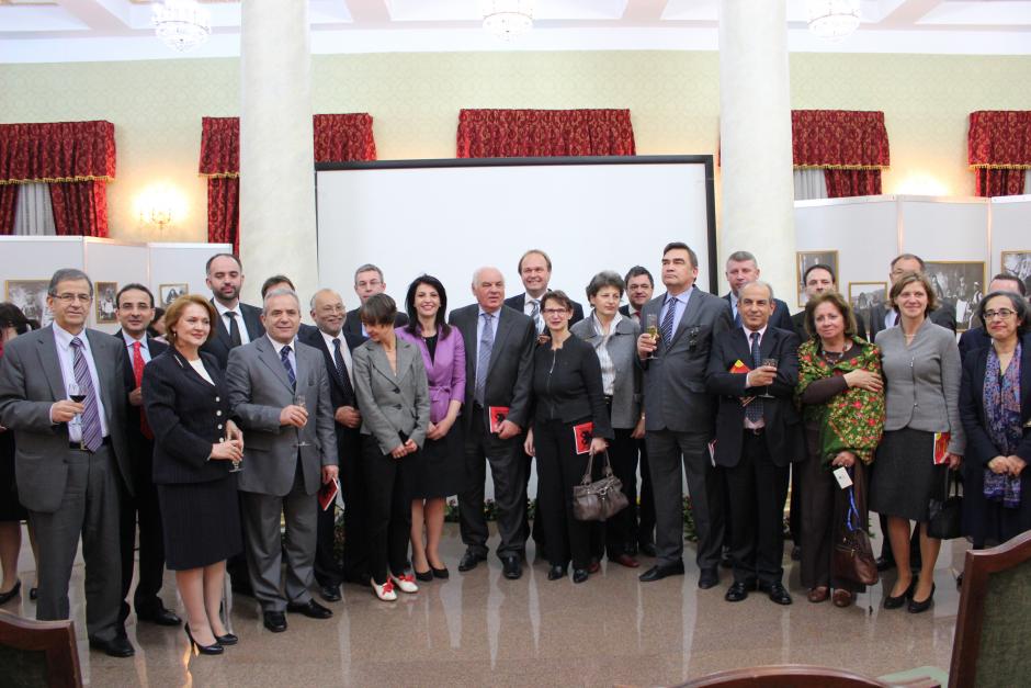 The Head of the OSCE Presence, Ambassador Eugen Wollfarth, Assembly Speaker Jozefina Topalli, former Albania’s President Alfred Moisiu, high representatives of the diplomatic corps and Members of Parliament attend an event marking the Presence's 15th anniversary, Tirana, 27 March 2012.
