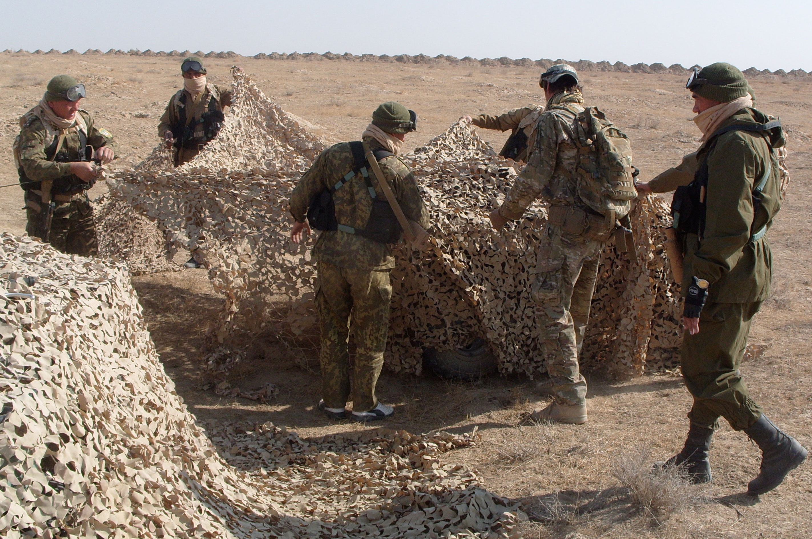Turkmen border officials camouflaging all-terrain vehicles during a desert patrol at the border crossing point of Imamnazar, October 2009.