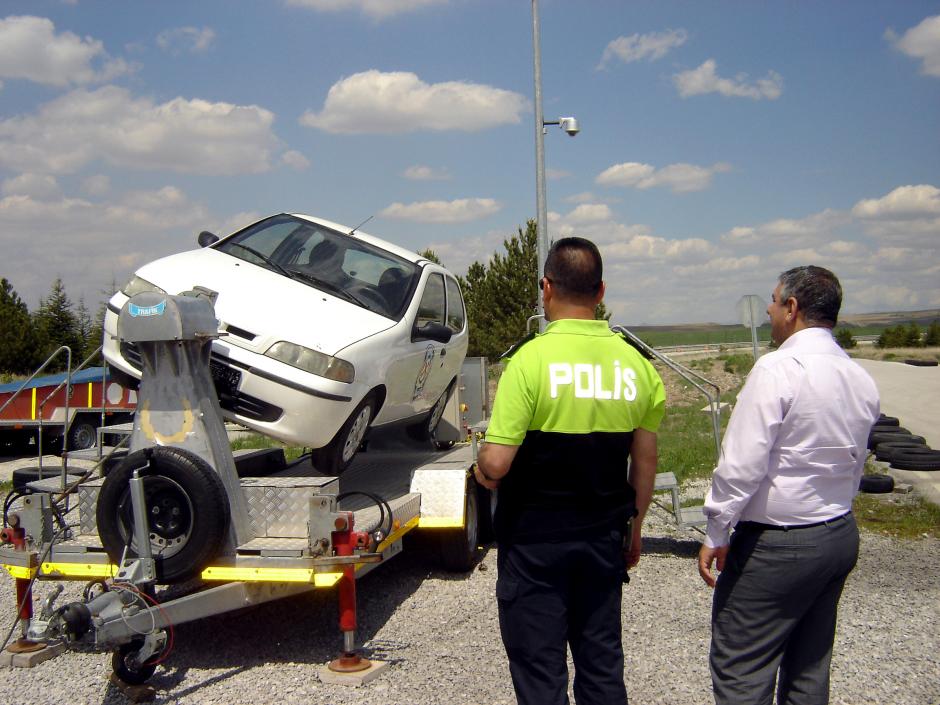 As part of the study visit to Ankara, three Turkmen Interior Ministry officials visited the Defensive Driving Training Field which is operated by the Turkish National Police. This vehicle turns upside-down, and is used to demonstrate the importance of wearing seat belts. Ankara, 20 May 2014.