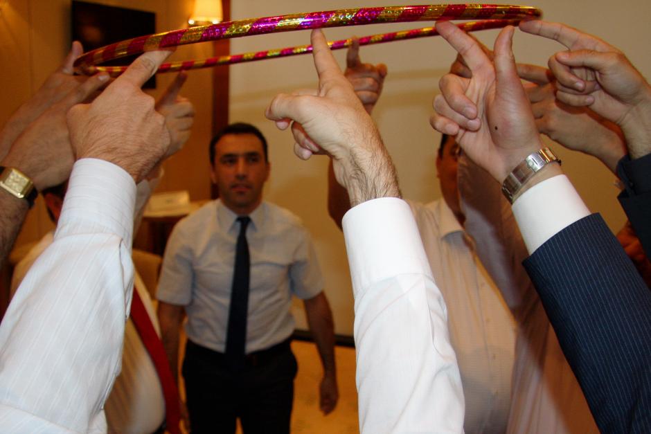 An international expert from Turkey (c) conducts a practical exercise/example on team co-ordination between various law-enforcement agencies in handling the crisis, held as part of the OSCE organized training on counter-terrorism hostage negotiations tactics, Ashgabat, 21 July 2015.