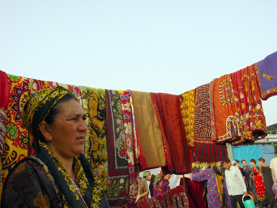 A vendor sells hand-made carpets at an open air market in Ashgabat, June 2006.