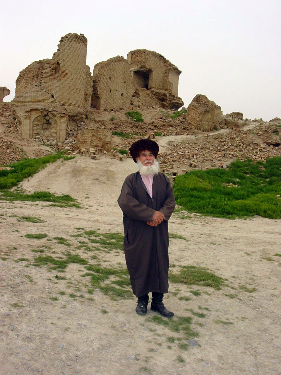 An elderly man stands in front of the remains of an ancient city in Turkmenistan. Photo taken June 2006.