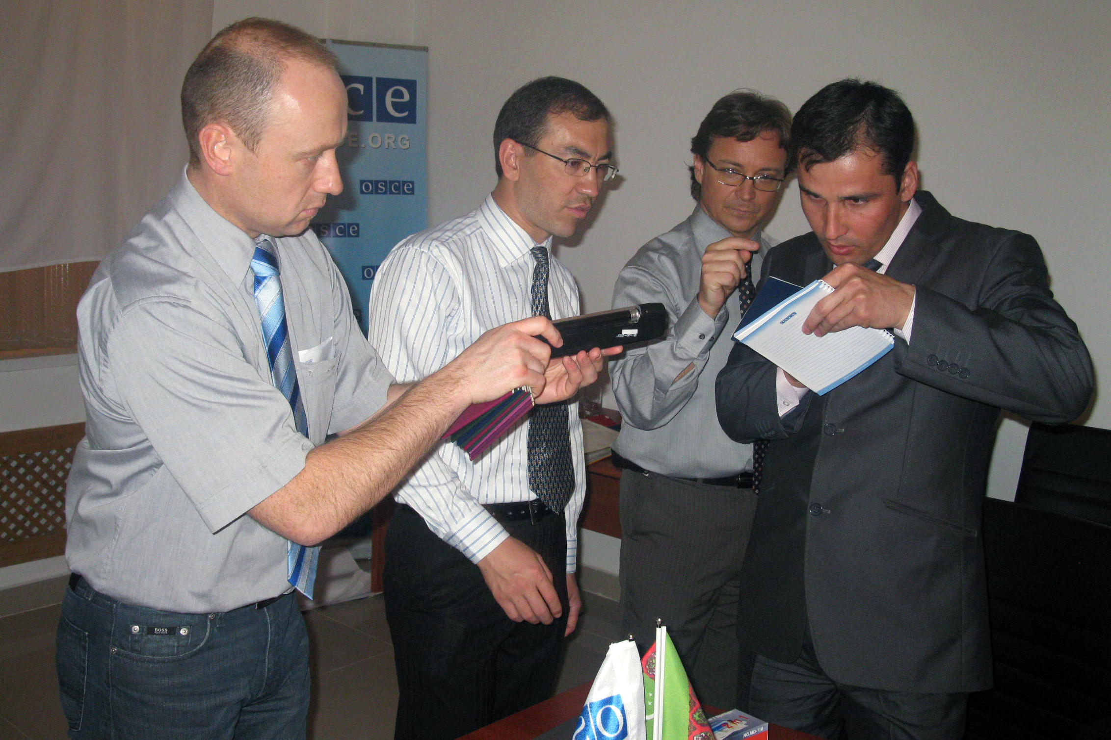 Participants at a training course on travel document security organized by the OSCE Centre in Ashgabat take part in a practical exercise, Turkmenabat, 25 March 2010.
