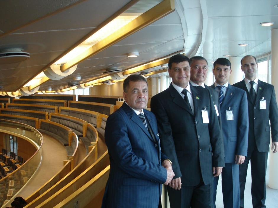 Members of Turkmenistan's Mejlis (Parliament) and a representative from the National Institute for Democracy and Human Rights during a guided tour of the Riksdag, part of a study visit to Sweden, organized by the OSCE Centre, September 2008.