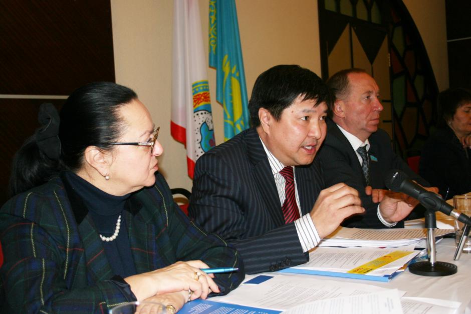 Jeannette Kloetzer (l), Deputy Head of the OSCE Centre in Astana, with Members of Parliament Zhakip Asanov (c) and Nikolai Turetskii (r) during a conference on combating domestic violence, 26 February 2009.