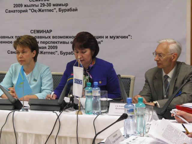 Alexandre Keltchewsky (r), Head of the OSCE Centre in Astana; Gulshara Abdykalikova (c), Minister of Labour and Social Protection; and MP Elena Tarasenko at a seminar on the draft law on gender equality, Borovoye, northern Kazakhstan, 29 May 2009.