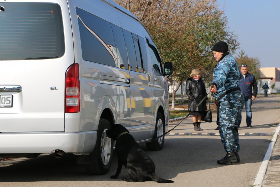 A dog-handler expert works with a Labrador to identify concealed explosives in a minivan during a practical exercise at the Customs Control Committee Cynology Centre, Almaty, 31 October 2014.