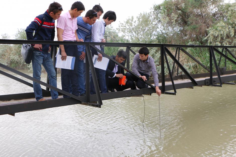 The hydraulic engineers are testing the advanced water-metering devices at the Baikadam water facility, Kyzylorda, 14 May 2015.