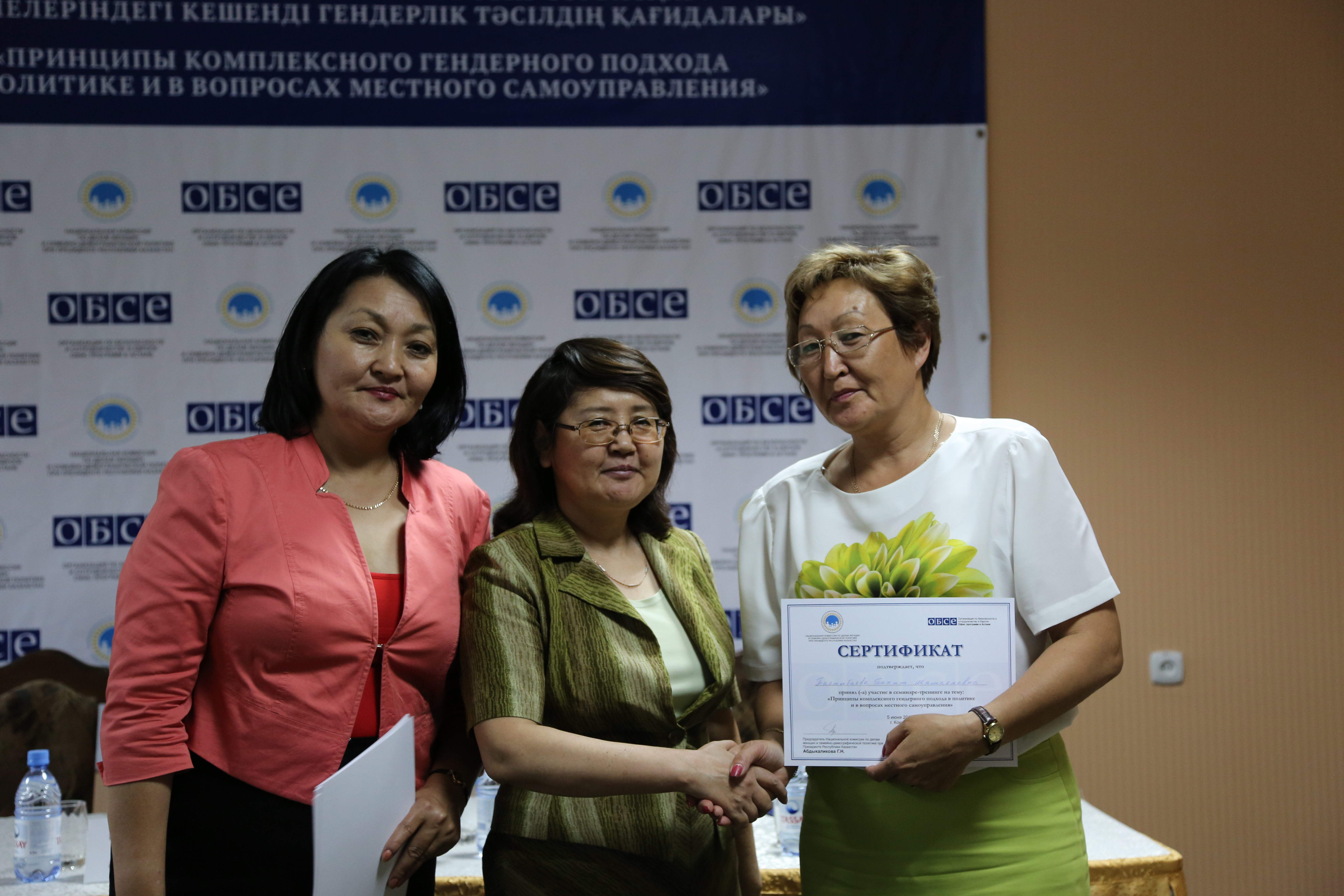 Gaukhar Nurakhmetova (left), member of the National Commission on Women’s Affairs and Family Demographic Policy under the President of Kazakhstan, Zauresh Battalova (centre), Head of the Public Foundation for Parliamentary Development in Kazakhstan, congratulate Bakhit Tasilbayeva (right), Deputy Head of the Akimat of the Bolandykskiy District in the Akmola Oblast, and present her with a certificate for her participation in the event, Kokshetau, 5 June 2015.