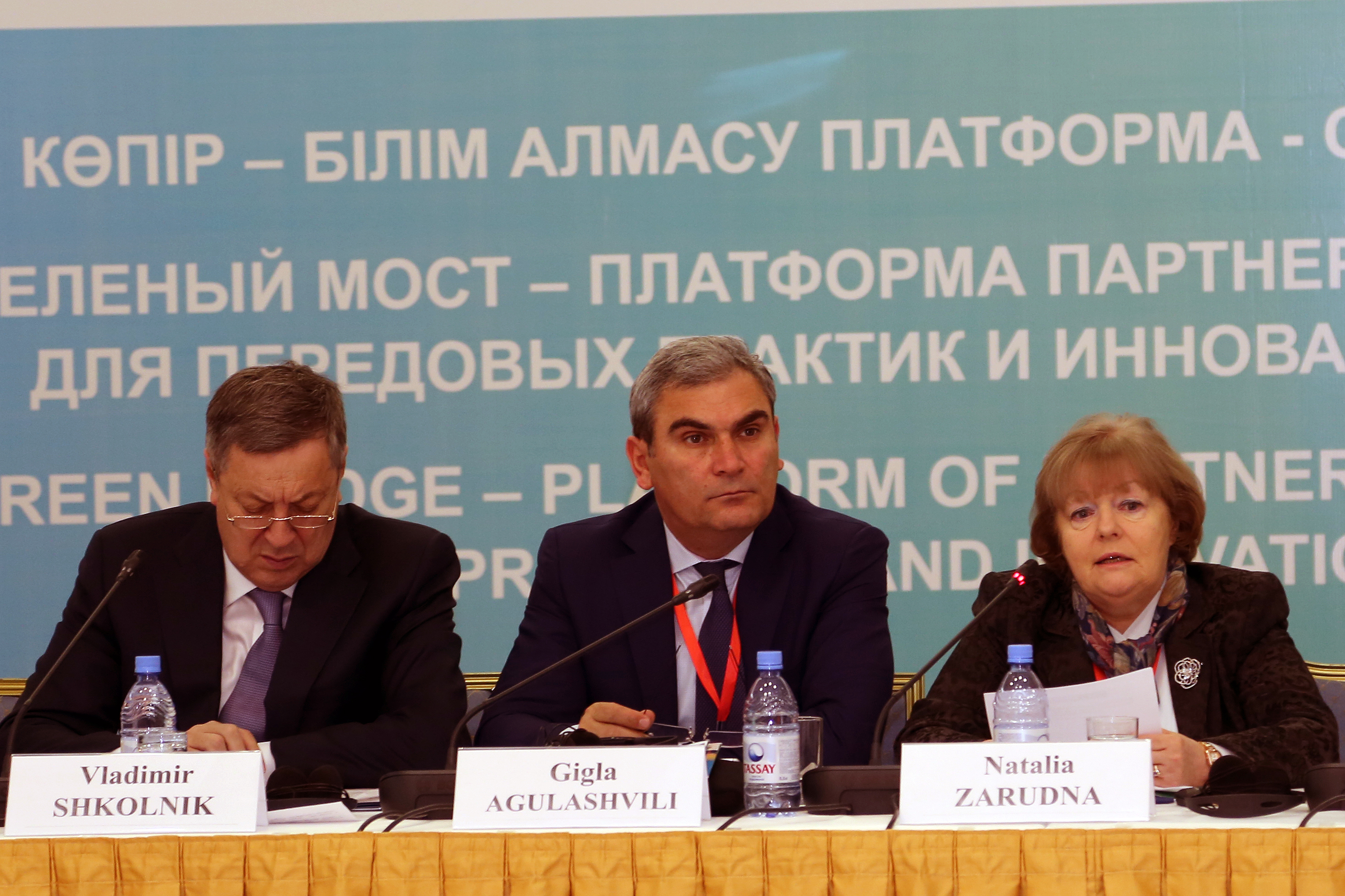 (L-r) Vladimir Shkolnik, Energy Minister of Kazakhstan, Gigla Auglashvili, Minister of Environment and Natural Resources Protection of Georgia and Ambassador Natalia Zarudna, Head of the OSCE Programme Office in Astana speaking at the Green Bridge Partnership Programme conference, Astana, 13 November 2015.