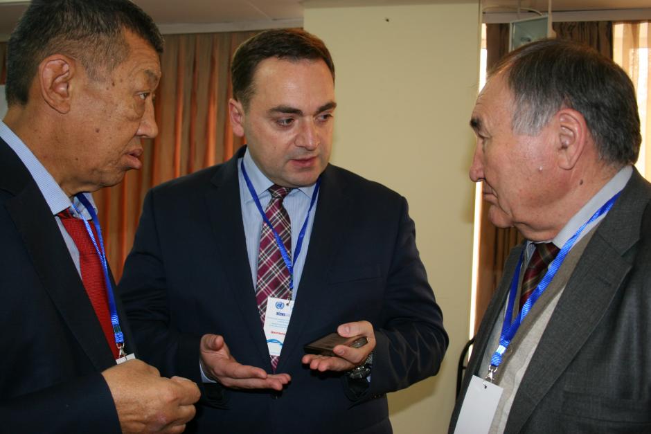 Rati Japaridze of the OSCE Programme Office in Astana (centre) speaks with representatives of the International Foundation of the Aral Sea about co-operation, Almaty, 3 December 2015.