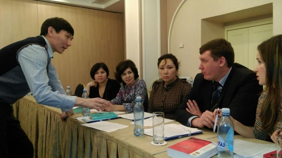 Defence lawyers discussing the strategies of collection of evidence during a group exercise, Astana, 4 December 2015.