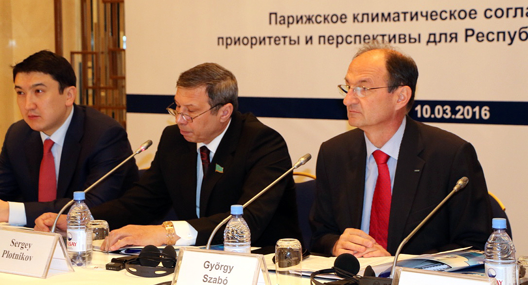 Ambassador György Szabó, Head of the OSCE Programme Office in Astana, Sergey Plotnikov, Deputy of Senate of Parliament and Magzum Mirzagaliyev, Deputy Energy Minister during an opening of the conference on reducing greenhouse gas emissions in Kazakhstan, Astana, 10 March 2016.