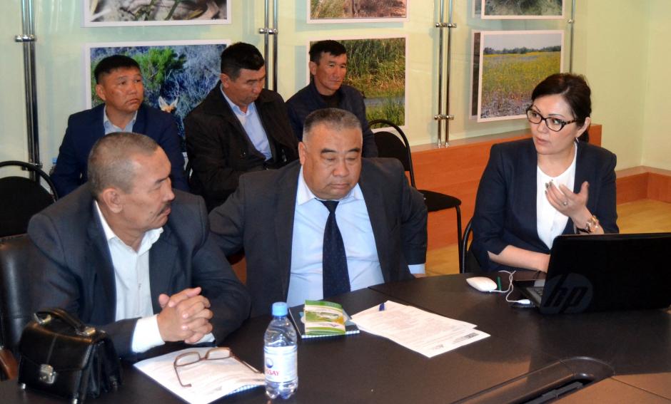 Aigul Jumadilova, Chairperson of the Board of the Public Fund “Kyzylorda Aarhus Centre”, speaking about problems related to the handling of pesticides and disposal of pesticide containers, Aralsk, 29 April 2016.