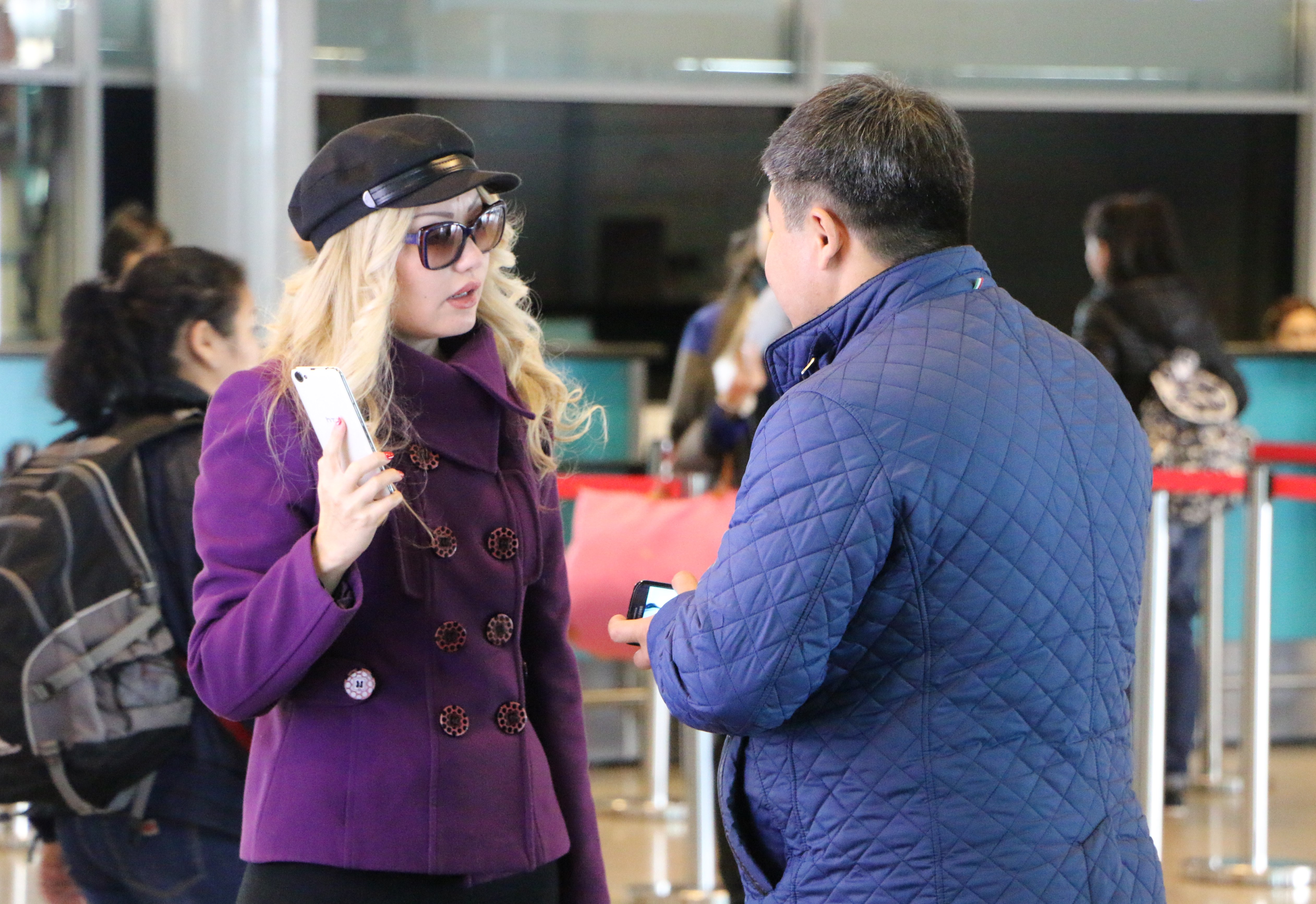 A border guard (r) using newly acquired profiling techniques to question an airport visitor - an actual actress specially trained for the role of a smuggler, during a training exercise at Astana International Airport, 13 October 2016.