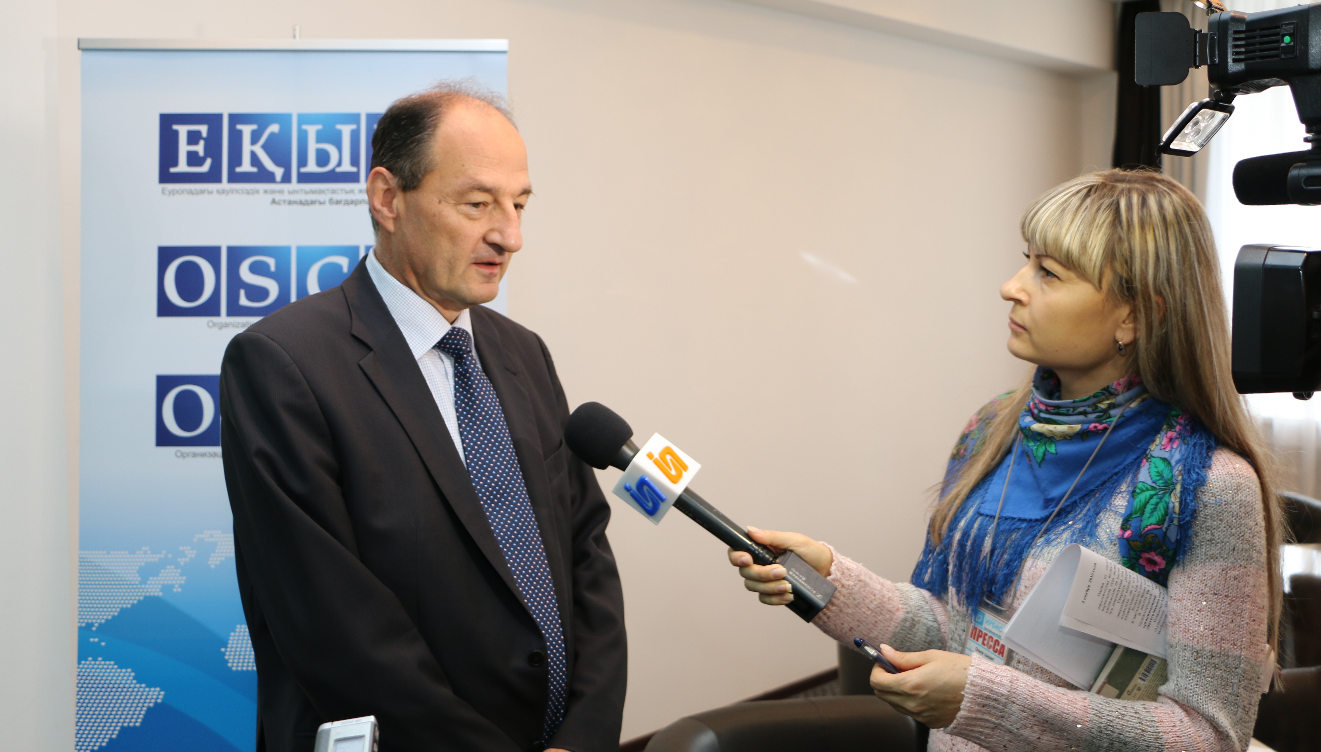 Ambassador György Szabó gives an interview to the local media channel on the subject of countering transnational organized crime, new psychoactive substances and synthetic drugs, Pavlodar, 2 November 2016.