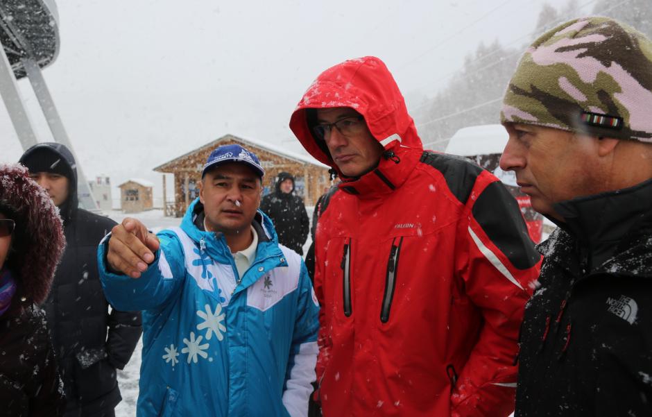 A local security official explains the layout of the Universade Winter Games 2017 venue and the relevant security protocols to an expert from the Dutch Police Academy during a site visit to the Shymbulak ski resort, Almaty, 4 November 2016