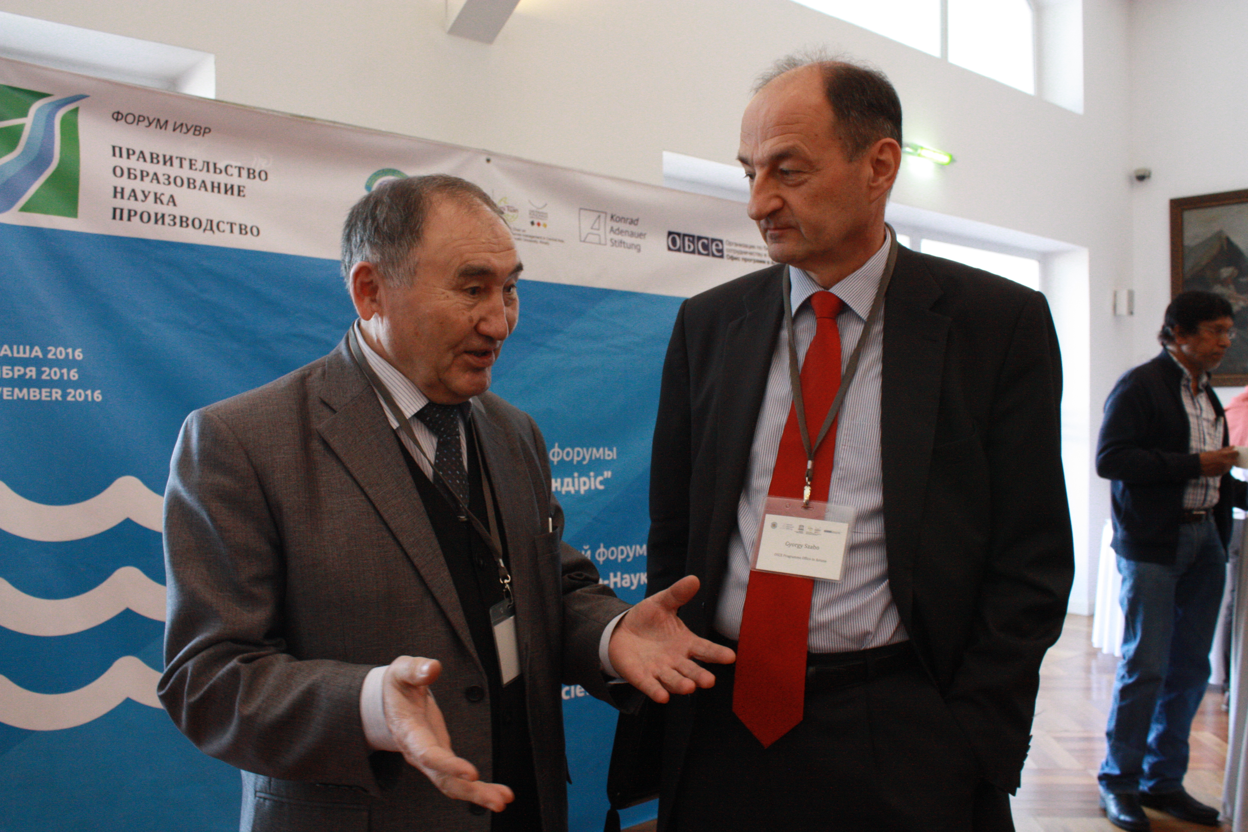 (r-l) Ambassador György Szabó, Head of the OSCE Programme Office in Astana and Amirkhan Kenshimov, Deputy Head of the International Foundation of the Aral Sea Executive Directorate in Kazakhstan discuss the current state of water education in the country, Almaty, 28 November 2016.