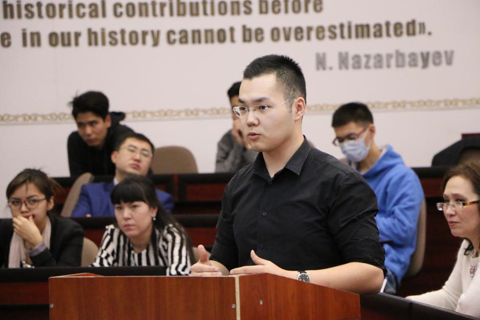 Participant of the debate tournament at the International Youth Legal Forum defends his point of view, Astana, 10 December 2016.